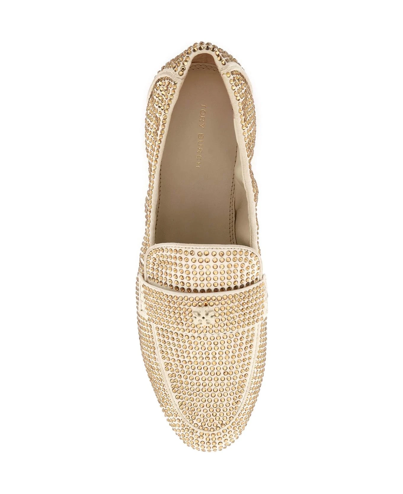 Ballet loafers by Tory Burch in suede with all-over crystal appliques. Varnished-metal double T monogram applied on the penny-bar, stretch side edges, leather lining, insole and sole with rubber inserts.