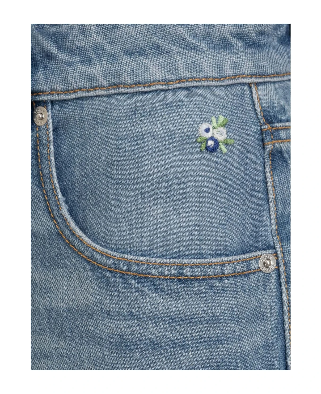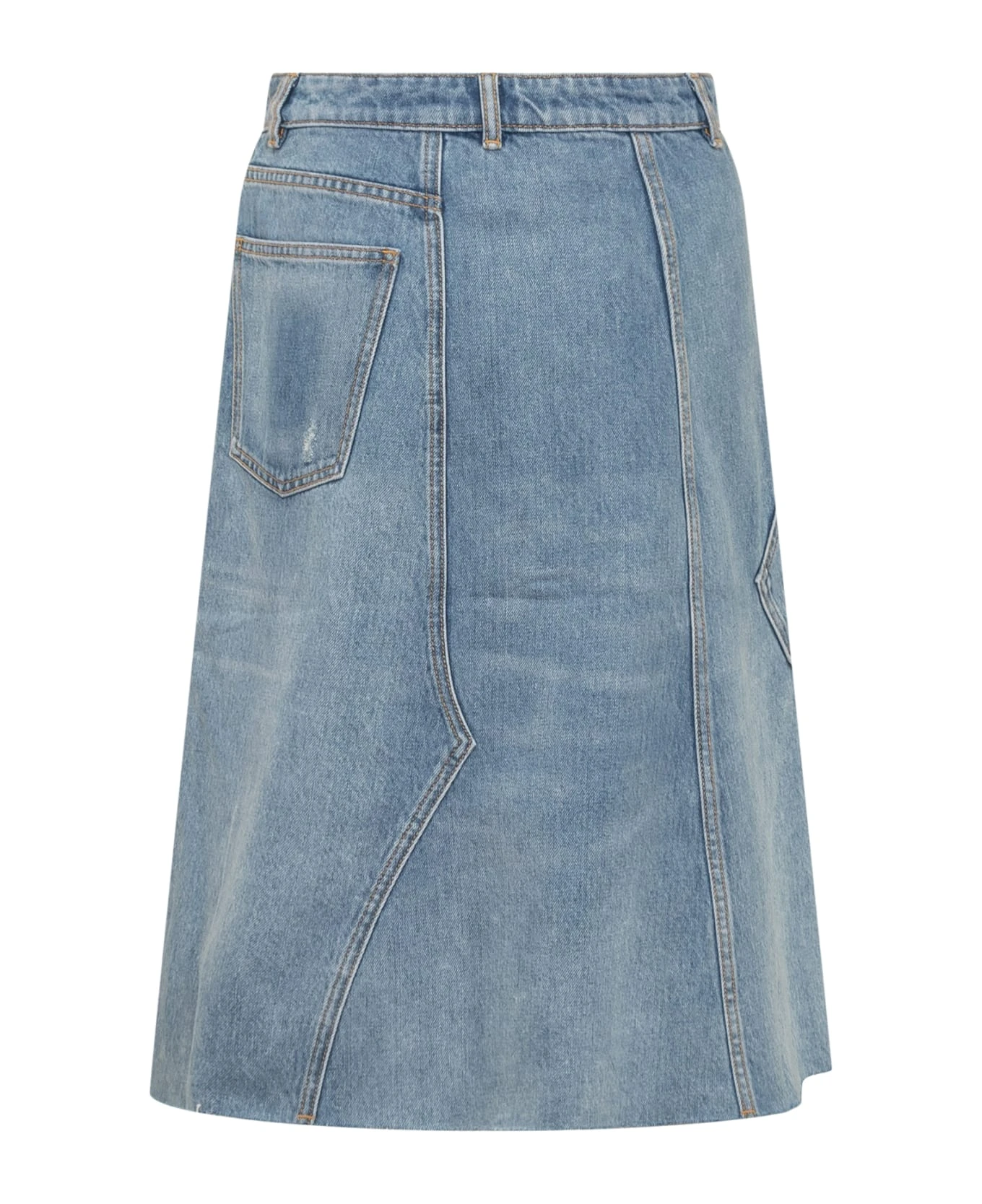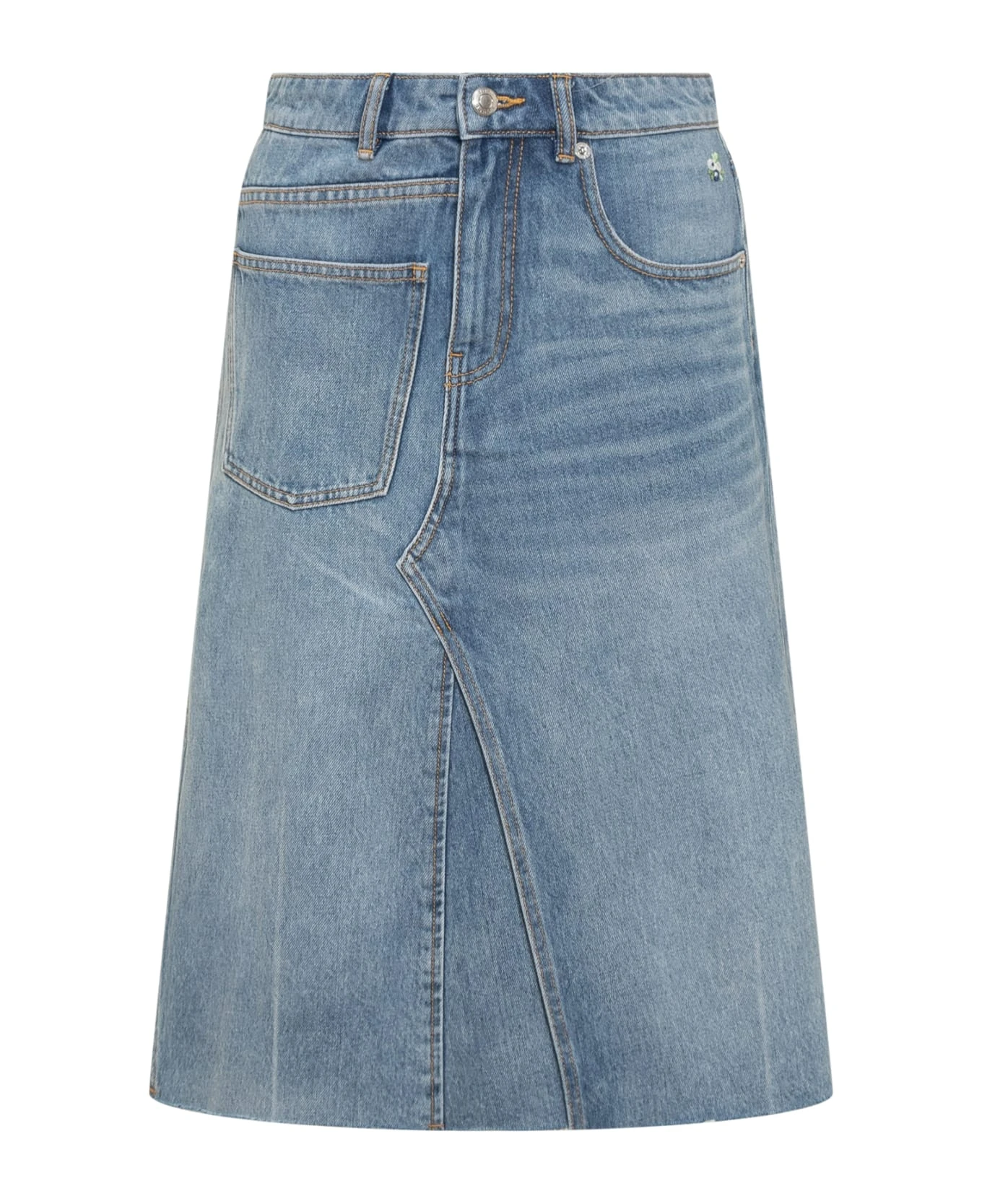 Denim long skirt. Zipper and button closure. Belt loops. 3 pockets. Embroidery on side pocket. Raw cut effect on bottom.