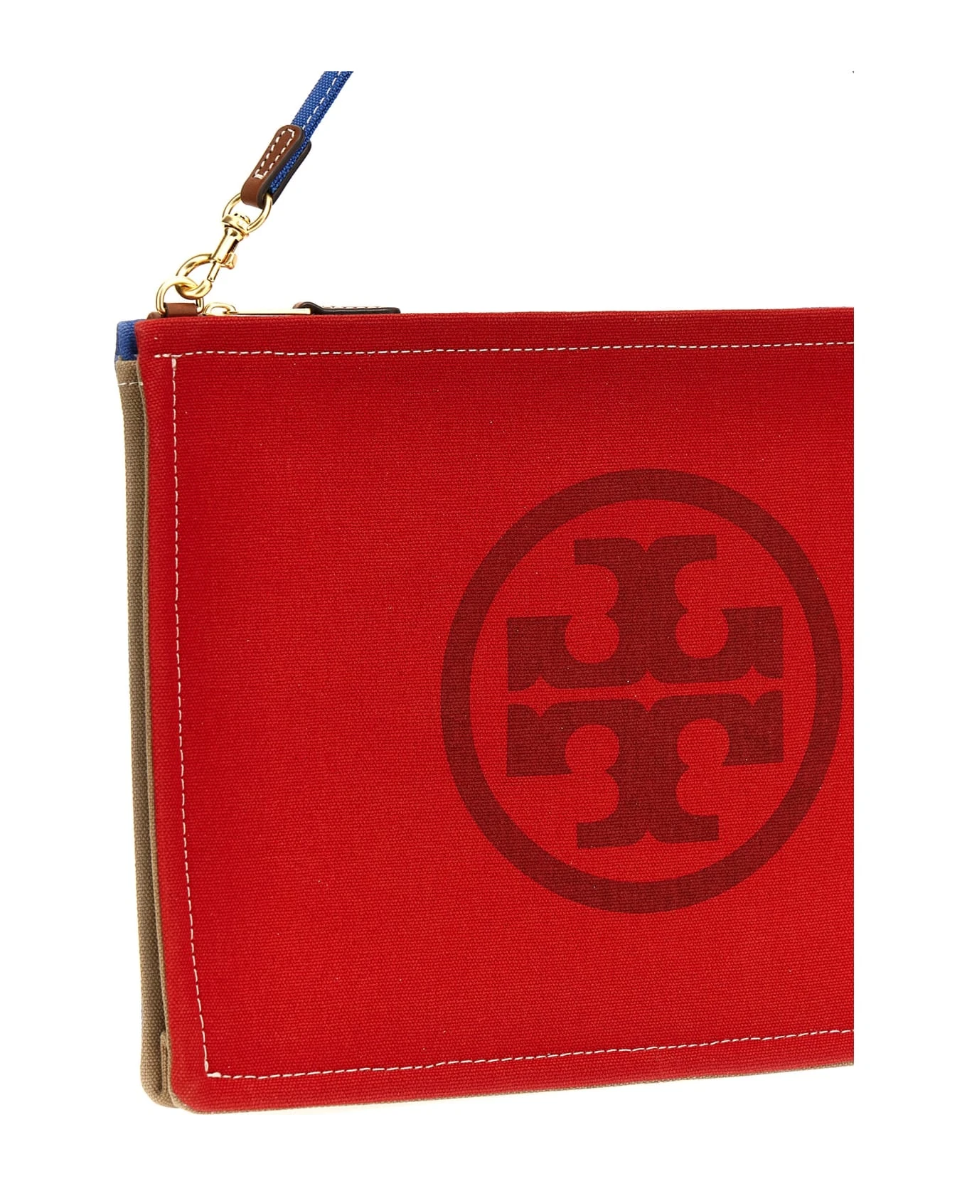‘Ella’ colorblock canvas clutch bag, leather details, zip closure, removable wrist handle, and front logo print.