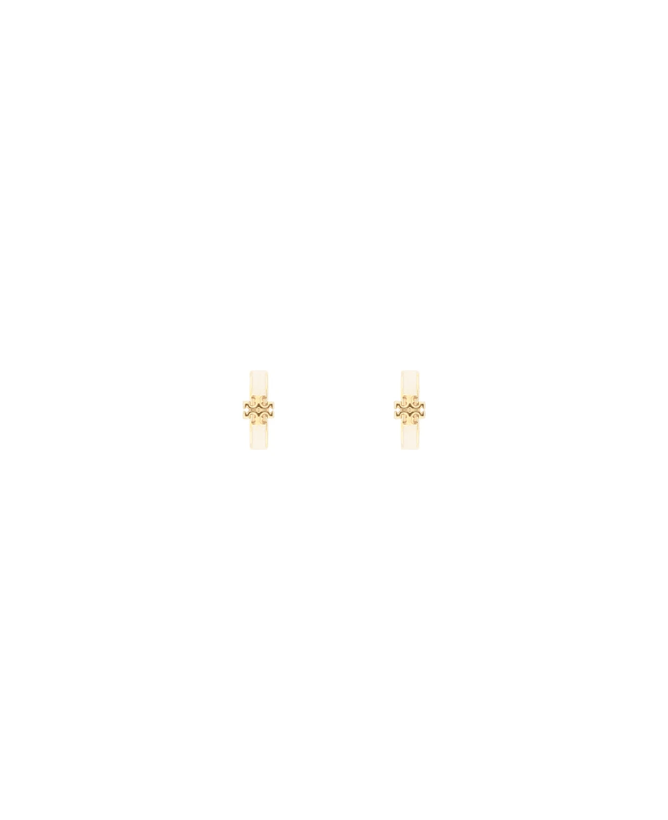 Kira hoop earrings by Tory Burch in enameled gold-finished brass and double T monogram detail. Huggie closure.